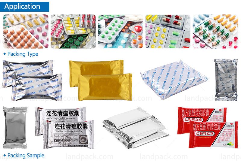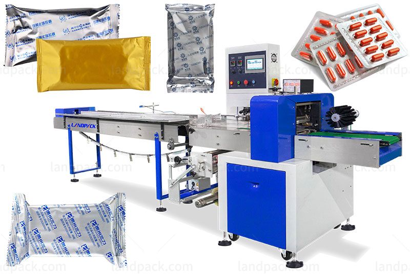 Automatic horizontal flow wrapping packing machine is suitable for packing various pharma materials such as pharma pills, ointment tablets, medicine patches, masks, foot patches, drug capsules, etc.