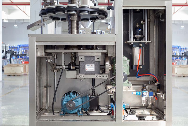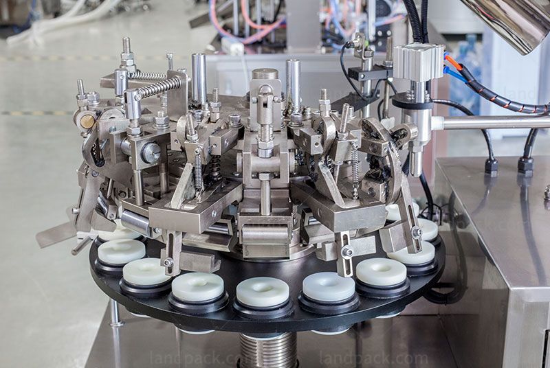 2.The rotary table equipped with fixture is driven to move intermittently by the Geneva indexing mechanism to complete a series of functions, such as automatic pipe laying, automatic filling, internal and external heating, tail sealing, code pressing, edge cutting, finished product exit, etc;