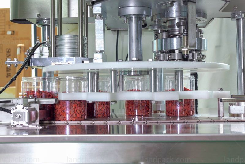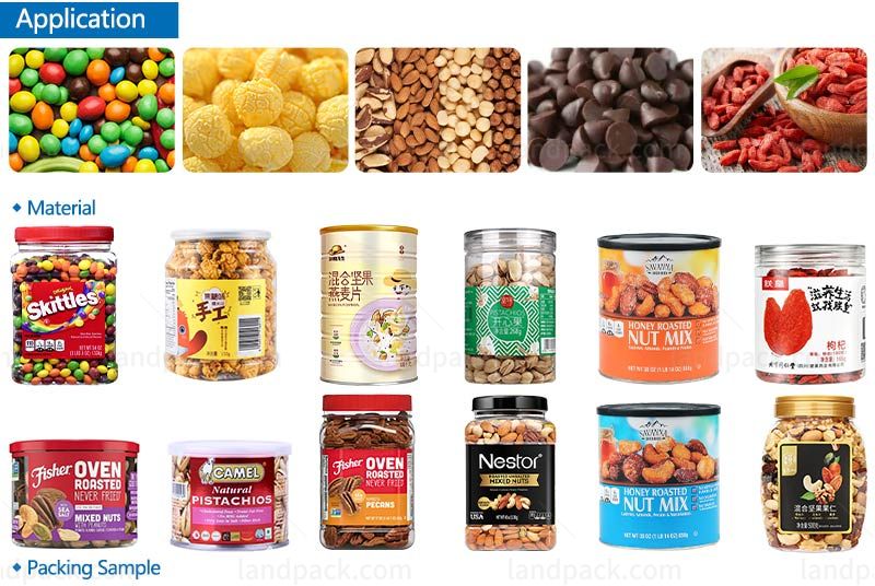 Full automatic granule bottles weighing filling capping and labeling lines, Scope of application: granular and solid materials such as nuts, beans, peanuts, snacks, cashew, sugar, rice, beans, condiments, washing powder, feed, desiccant, plastic pellets, grains, etc.