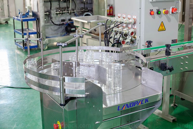 2. This line uses automatic bottle feeding, linear scale filling machine, four-wheel capping machine, wafer positioning round bottle labeling machine, and collection platform to form a fully automated production line;