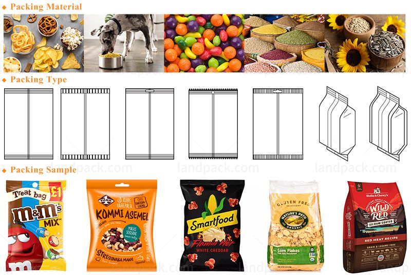 1. Food Industry: popcorn, peanuts, jelly, data, garlic, beans, grains, soybeans, pistachios, walnuts, rice, corn, sunflower seeds, melon seeds, coffee beans, potato chips, banana chips, plantain chips, chocolate ball, shrimp, sweet candy, sugar, tea, herbs, Chinese medicine, puffed food, dry food, frozen food, frozen vegetables, frozen pea, frozen fish ball, frozen pie, and other granule products.