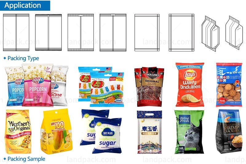 Suitable for packing all kinds of granule material, sheet material, strip material and abnormity material which such as popcorn, potato chips, snacks, candy, sunflower seeds, peanut, nuts, beans, almond, dry fruit, vegetable salad etc.