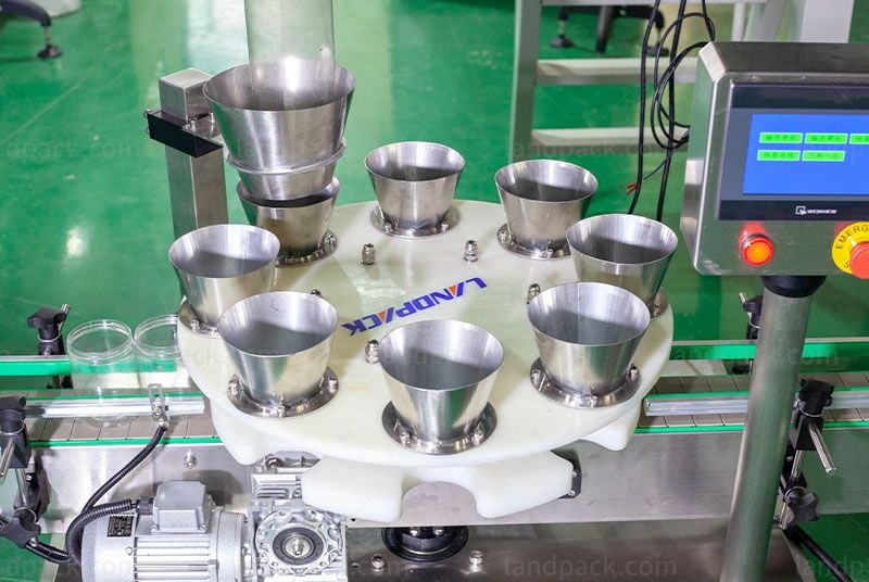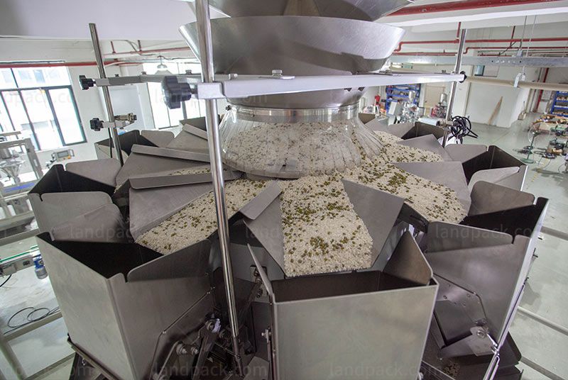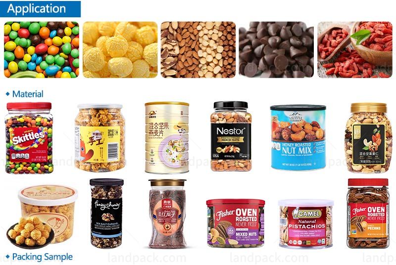 Full automatic granule bottles weighing filling capping and labeling lines, Scope of application: granular and solid materials such as nuts, beans, peanuts, snacks, cashew, sugar, rice, beans, condiments, washing powder, feed, desiccant, plastic pellets, grains, etc.