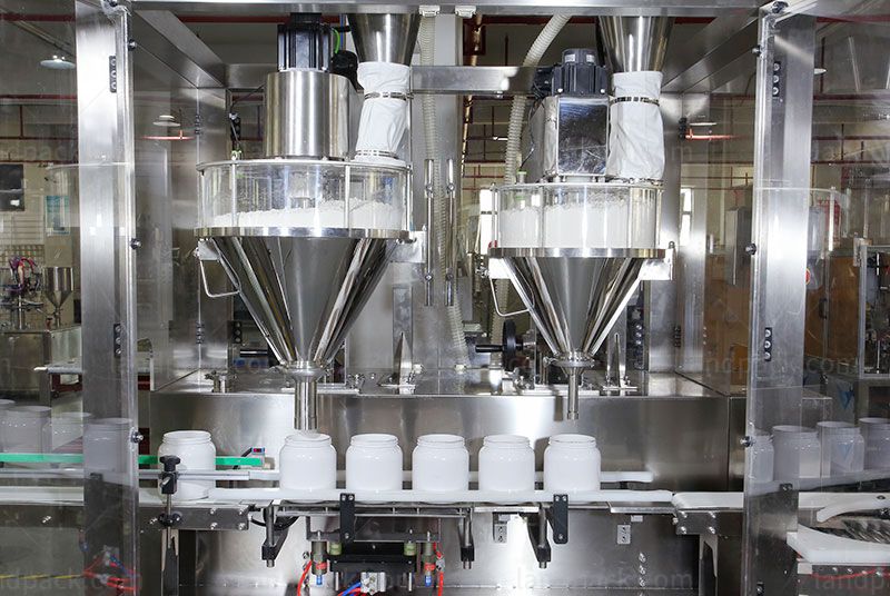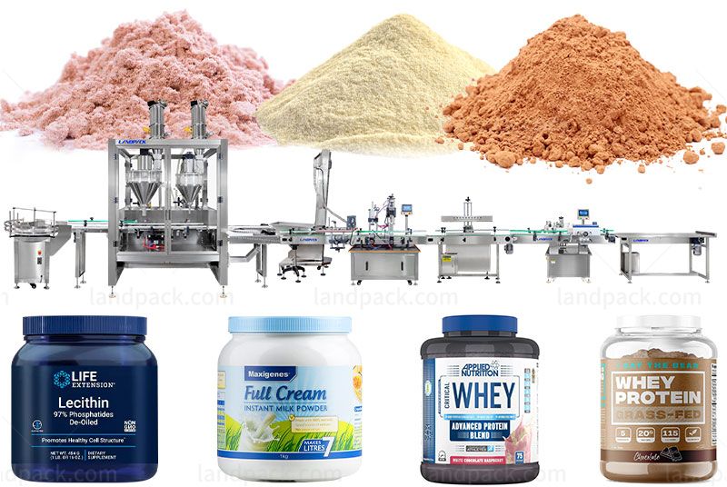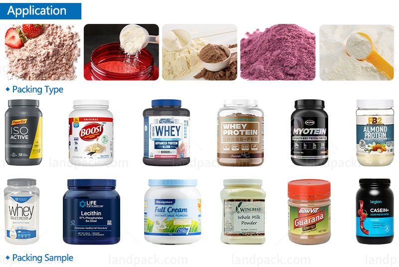 This powder filling line is suitable for powder material such as milk powder, protein powder, health powder, medical powder, nutrition powder, monosodium glutamate, solid beverage, icing sugar, dextrose, feed, coffee, solid medicament, dye, etc.