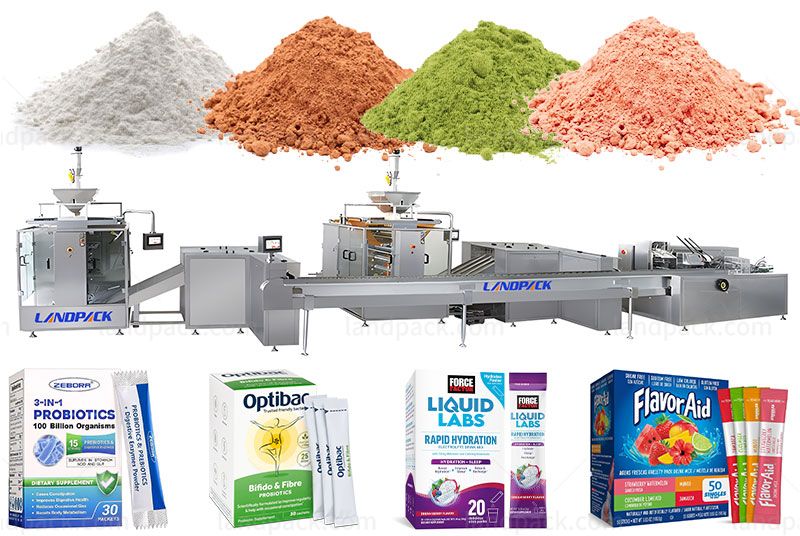 High speed multilane bagging and cartoning packaging line system suitable for the automatic filling of various powder products, such as milk powder, protein powder, nutritional powder, coffee powder, medicine powder, chemical powder, meal replacement powder, etc.