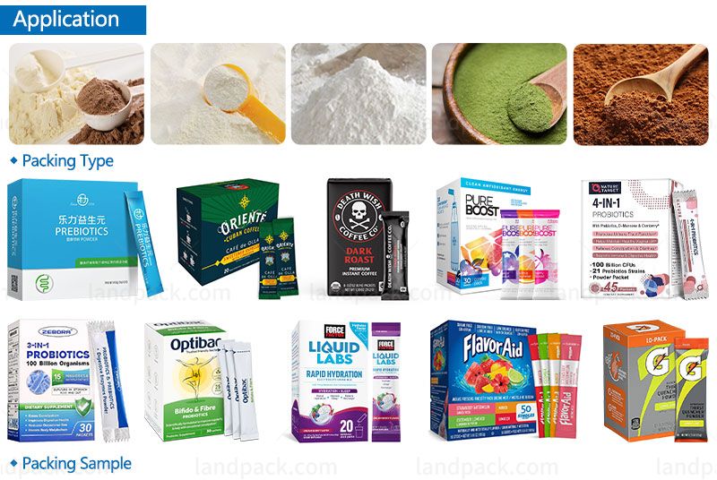 This stick packaging machine line consists of LD-480Y-2 multi-lane stick pack fine granule and powder packaging machine, small bag sorting conveyor, electronic weighing machine, weight sorting scale, and cartoning machine. It can realize stick packed packaging into boxes.