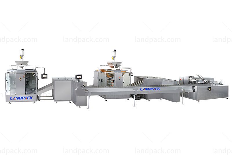 1. It is suitable for automatic connection and boxing of 3/4 side sealing bags or stick packs. Online can complete automatic vacuum feeding, bag making, filling, batch numbering, cutting and tearing, bag-shaped punching, bag picking arrangement and transmission, single bag weighing, missing and less filling removal, automatic counting of finished bags, stacking and transferring, manual-folding, carton forming, finished product bag boxing, batch number imprinting, carton packaging, waste rejection, finished product output, product counting, etc. can be automatically completed.