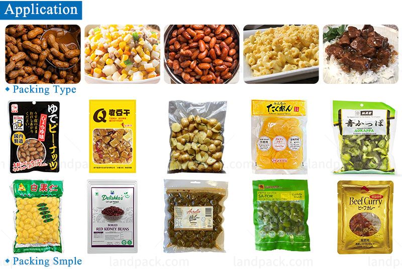 Application Product | 1. Any product that can pack in bag, such as fish, poultry, meat, grains and other food items. 2. Solid species: candy, peanut, green bean, pistachio, crystal candy, brown sugar, cookie, cake, daily commodities, cooked food, pickles, puffed food, etc. 3. Granule species: grain, refined monosodium glutamate, granular drug, capsule, seed, condiment, granulated sugar, chicken essence, melon seeds, nuts, pesticide, fertilizer, feed etc. 4. Liquid species: detergent, fruit juice, miller wine, soy sauce, vinegar, drinks etc. 5. Thick liquid species: chilli sauce, tomato sauce, peanut butter, jam, bean sauce etc. |