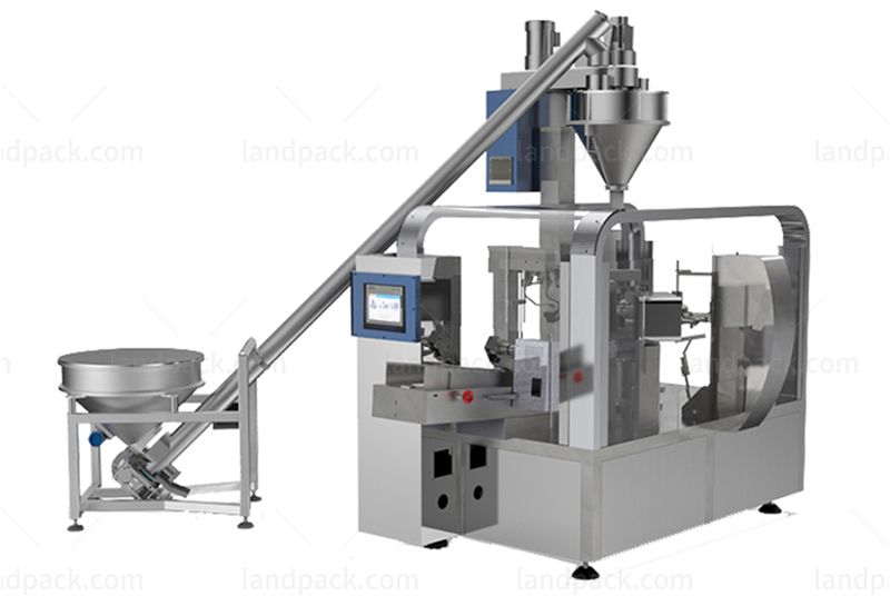 Full automatic intermittent rotary preformed bags dispensing, opening and closing machine combined with automatic auger powder filler, bulk screw feeder and product bulk hopper.
