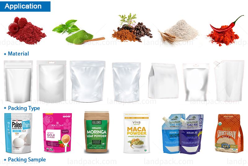 Suitable Pouches: All type of heat sealable preformed side seal bags, fin seal bags, gusseted bags, block bottom bags, zip-lock recloseable bags, stand-up pouch with or without spout ect.