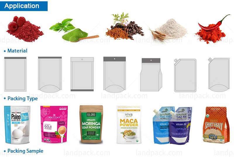Suitable for preformed bag powder packing , such as milk powder, glucose, monosodium glutamate, seasoning, washing powder, chemical materials, fine white sugar, pesticide, fertilizer, etc.
