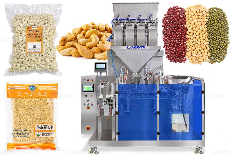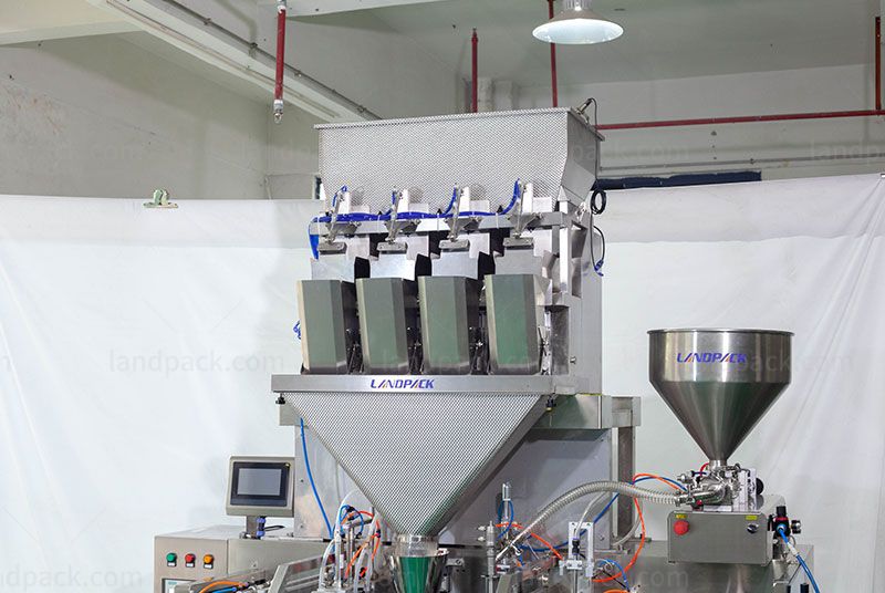 Automatic Granule Liquid Mixing Quantitative 3/ 4 Side Seal Packaging Machine With Vacuum Function, It is suitable for mixed quantitative packaging of various particles and liquids, and can be equipped with a vacuum function to increase freshness. Sutable Pouch: various premade pouch, doypack, such as 3/4 side seal bags, stand up bags, spout bags, etc.