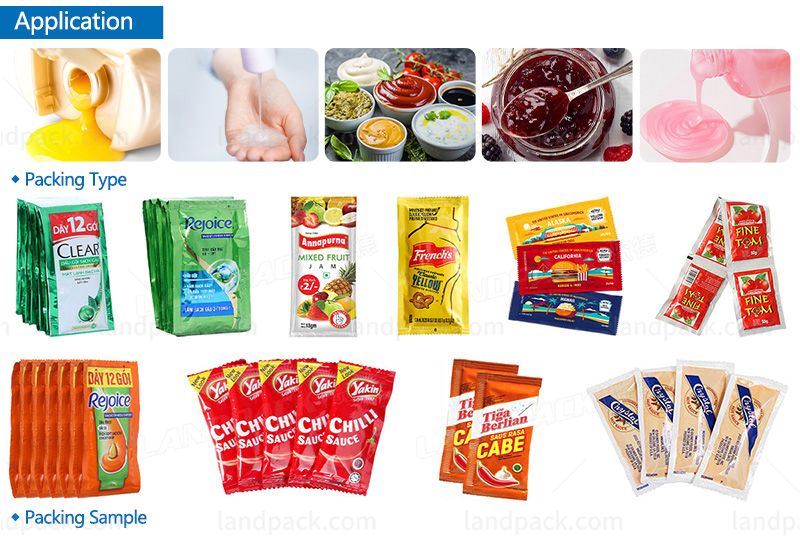 This multi track sachet packaging machine is suitable for all kinds of paste, and viscous liquid packaging, such as ketchup, jam, chili sauce, honey, pizza sauce, peanut butter, tartar sauce, chocolate sauce, chili sauce, cream, liquid butter, juice, shower gel, shampoo, etc.