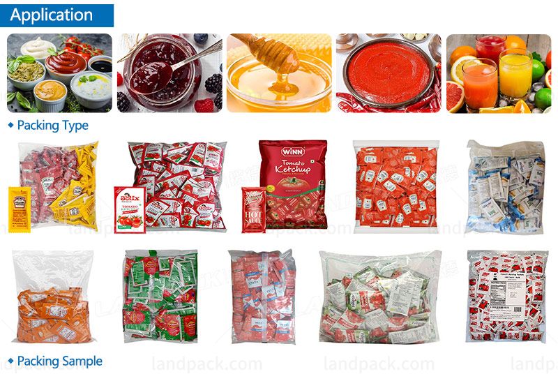 Automatic multilane liquid sachet counting into bag packaging line is suitable for kinds of liquid products, such as shampoo, shower gel, fruit juice, honey, milk, mouthwash, sauce, jam, jelly, etc.