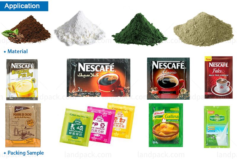 Suitable for packing loose, non sticky powder material in the medicine, food, daily chemical and other industry, and automatic packing into sachets with measuring requirement. Such as coffee powder, milk powder, soymilk powder, starch, drug, pulveres, and so on..