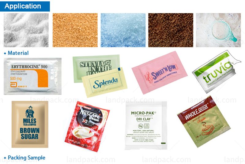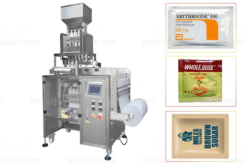 A high degree of automation, machine can finish packing at one time from longitudinal sealing, longitudinal cutting, transverse sealing, filling, embossing, notch cutting, cutting dotted line cutting, and transverse cutting to outputting finished sachets.