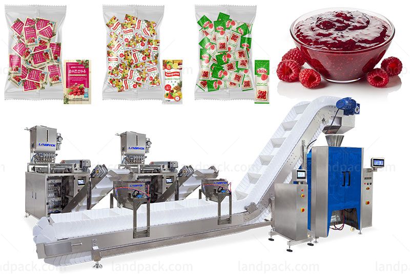 Automatic multilane liquid sachet counting into bag packaging line is suitable for kinds of liquid products, such as jam, olive oil, ketchup, shampoo, shower gel, fruit juice, honey, milk, mouthwash, sauce, jelly, etc.
