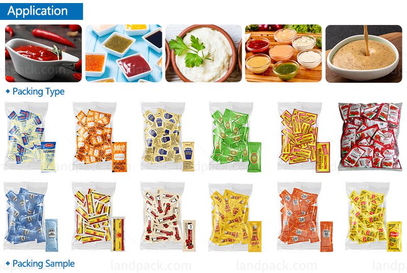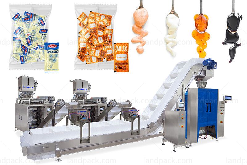 Automatic multilane liquid sachet counting into bag packaging line is suitable for packing kinds of liquid products, such as sauce, shampoo, shower gel, fruit juice, honey, milk, mouthwash, jam, jelly, etc.