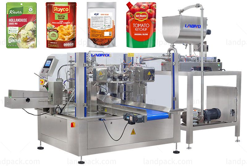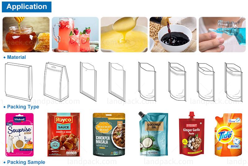 Suitable for All Kinds of Pre-Made Pouches, and liquid packing, such as sauce, rice vinegar, fruit juice, beverage, tomato sauce, peanut butter, jam, paste, etc.