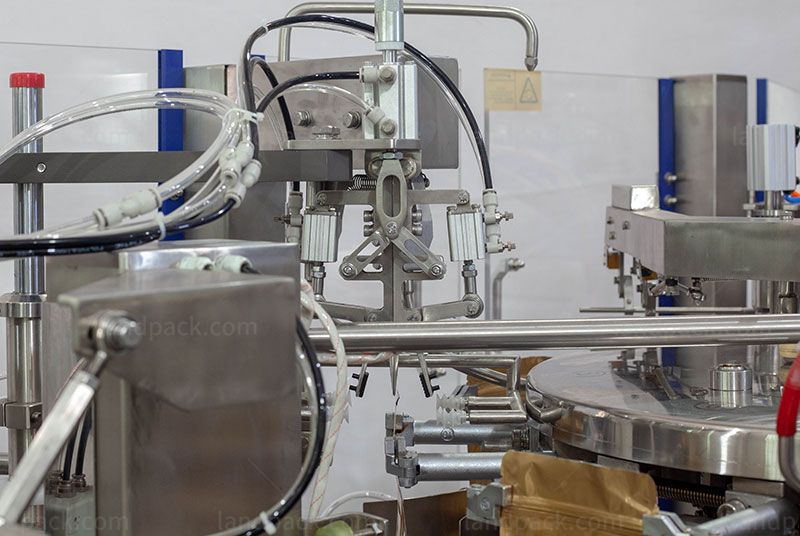 Workflow | giving bag→coding →opening →filling 1 →filling 2→auxiliary→exhaust→heat sealing→forming and output product |