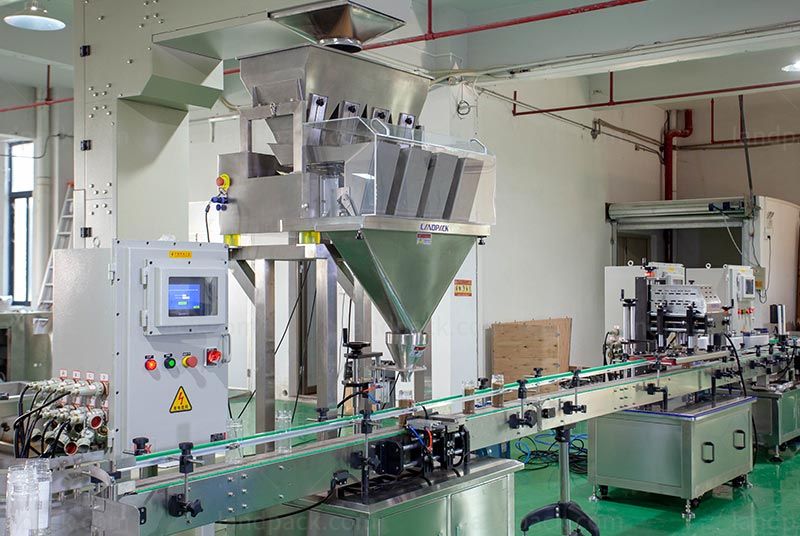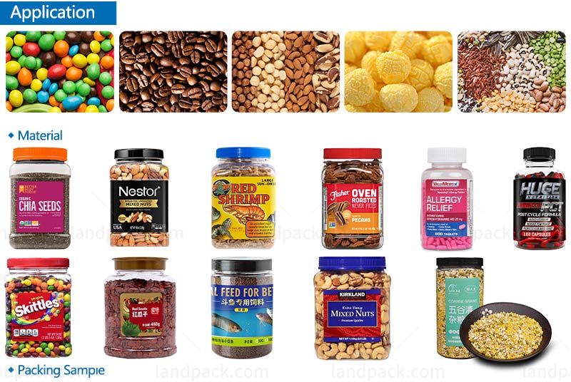 Full automatic granule bottles weighing filling capping and labeling lines, Scope of application: granular and solid materials such as nuts, beans, peanuts, snacks, cashew, sugar, rice, beans, condiments, washing powder, feed, desiccant, plastic pellets, grains, etc.