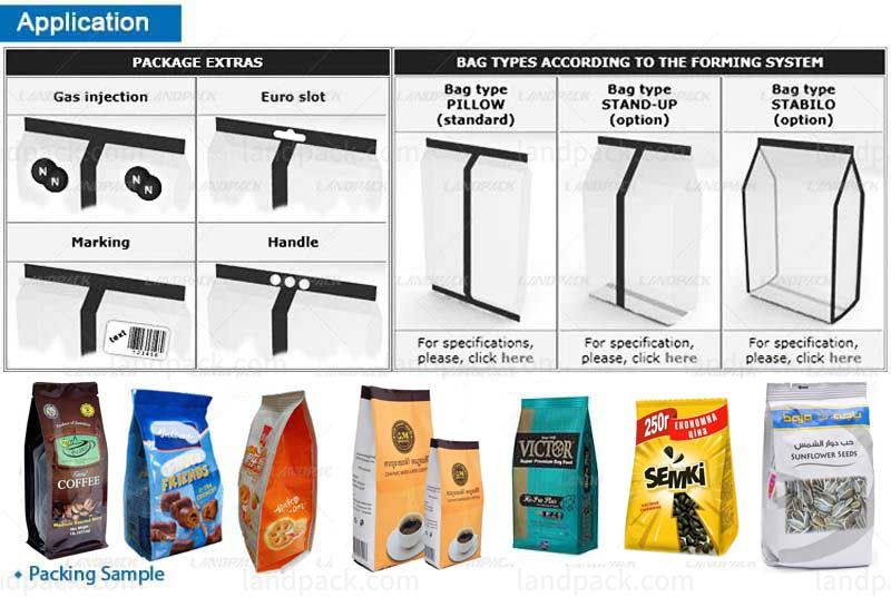 Quad Seal Bag / Block Bottom Pouch Packing Machine is Suitable for various kinds of Various Seeds, nuts, coffee beans, peanuts leavened food, candies, and such materials in grain or piece as well as powder like milk powder, washing powder, starch, etc.