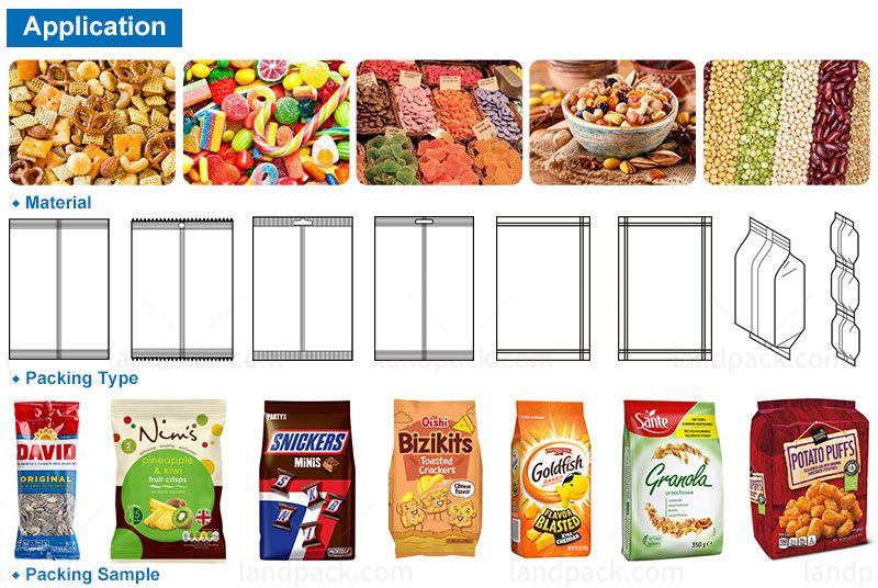 Suitable for packing all kinds of grain material, sheet material, strip material and abnormity material such as all kinds of seeds, sunflower seeds, candy, peanuts, nuts, beans, potato chips, popcorn, almond, dry fruit, vegetable salad (shredded or slices vegetables, like iceberg lettuce, etc.