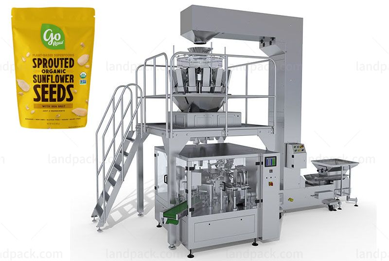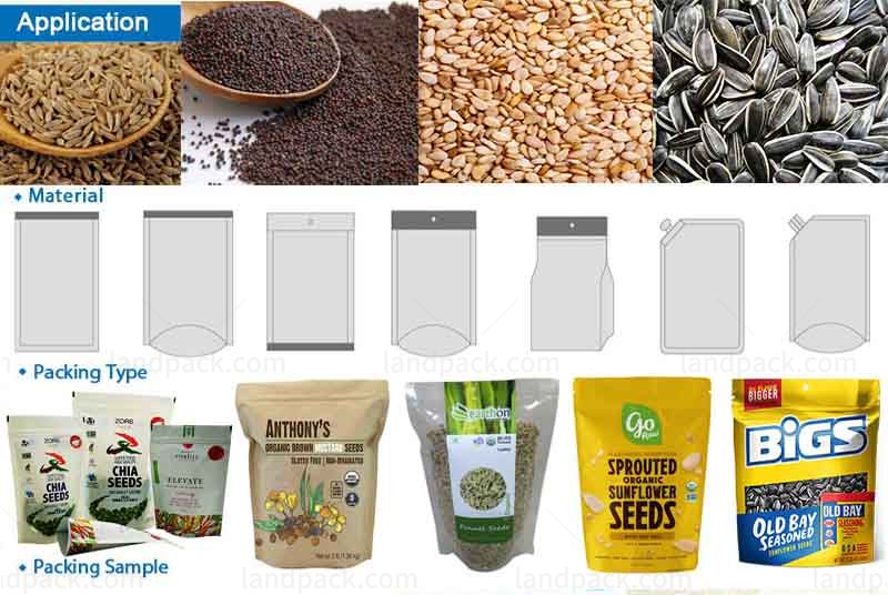Suitable for automatic packing for grain and solid food, such as All kind of Seeds, beans, nuts, dry fruits, candy, cereal, chocolate, biscuit, peanut, capsule, chemicals, sugar, etc. Different kinds of product with stand up pouches, doypack with zipper, 3 side seal bags, 4 side seal bags, flat bags, pouch with hole, spout pouch, etc.