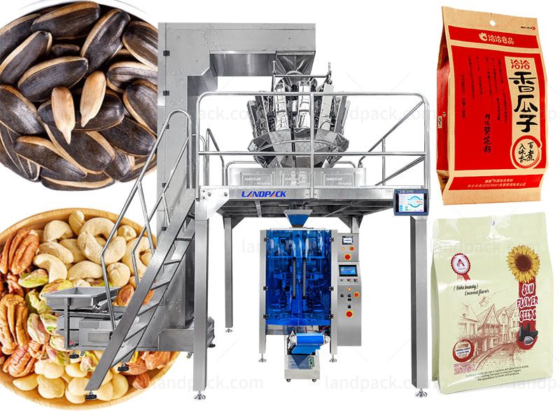 High Precision Sunflower Seeds Weighing And Packing Machine, It is suitable for packing all kinds of grain material, sheet material, strip material and abnormity material which such as all kinds of Seeds, Sunflower seeds, candy, peanut, nuts, beans, potato chips, popcorn, almond, dry fruit, vegetable salad (shreded or sllices vegetables, like iceberg lettuce, cabbage, romain, spring onion and leek ect.), frozen food, jelly, biscuit, chocolate, filbert, corn, pet food, dilatant foodstuff, hardware and plastic can be weighed by the ration.