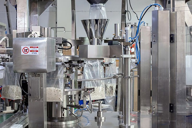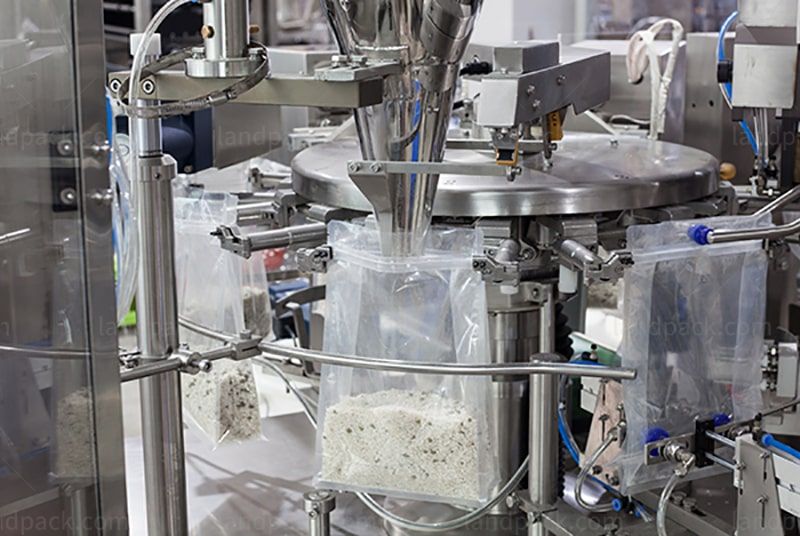 Multiple working station to meet full automatic process of bag pickup, date printing, bag opening, filling, bag arranging, sealing and output.