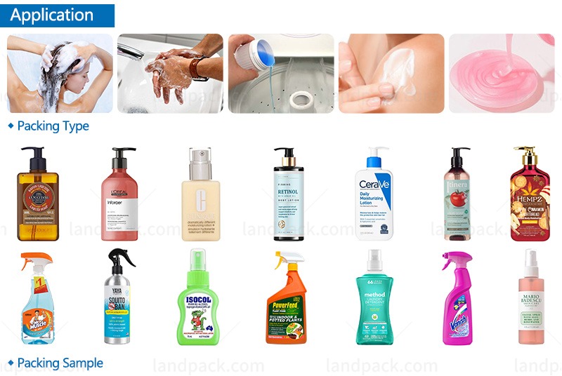 This auto-filling capping machine line is ideal for small and medium-sized bottles (100ml-1L) and is suitable for various industries to meet customer demand. Commonly used for cosmetics, personal care, and beauty packaging such as shampoo, body wash, daily chemical products like liquid hand soap, detergent, food and beverage such as sauce, honey, oil, pharmaceutical liquids like sanitizer, and oral medication. High filling speed, perfect tightness, easy operation, high efficiency, and uniform quality.
