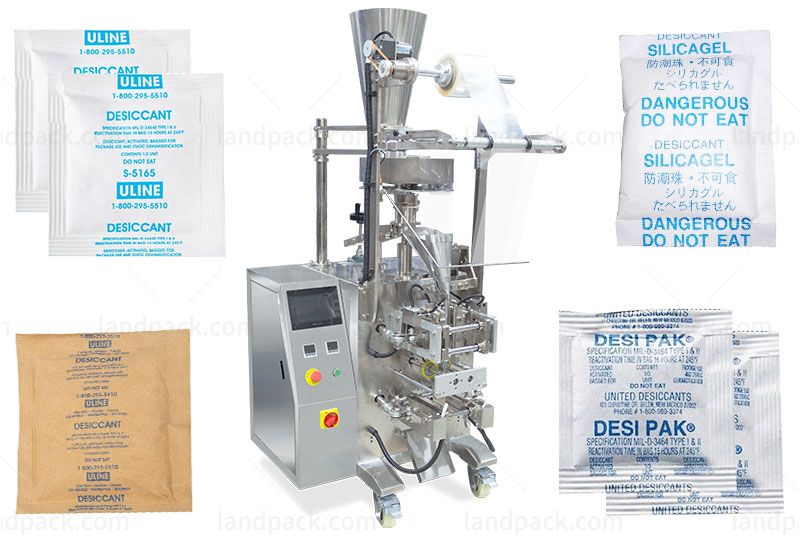 Suitable for small granule material, such as silica gel, desiccant, sugar, salt, crystal monosodium glutamate, seasoning, washing powder, pesticides, chemicals, feed and other small granule material automatic 4 Side Sealing Sachet packing.