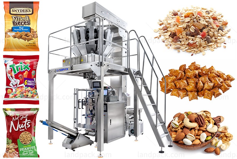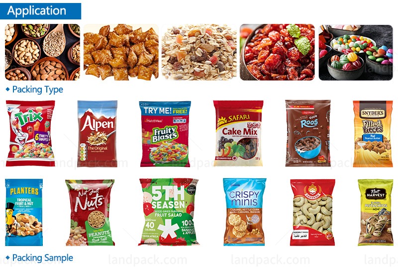 Automatic Nitrogen Packing Machine is suitable for various granule food products, including snacks, popcorn, oats, cereals, nuts, candies, beans, chips, frozen food, fried food, pet food, hardware, and more.