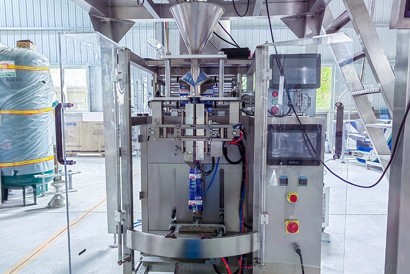 The machine automatically completes the processes of filling, metering, bag forming, date printing, sealing, and packing.
