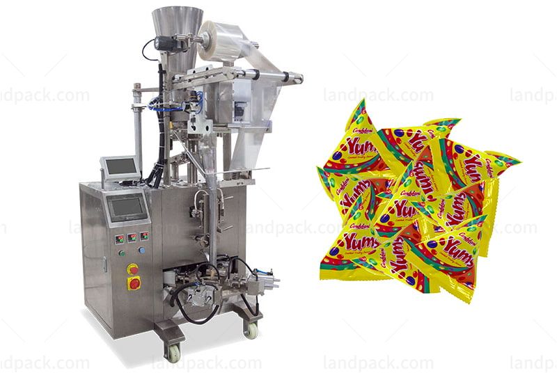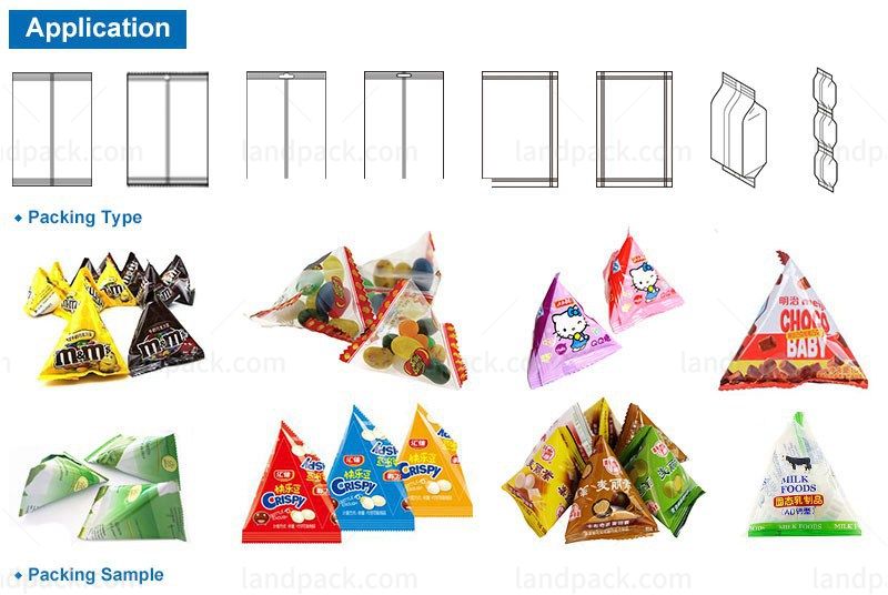 Automatic triangle bag packing machine for snacks beans etc, It is suitable for three-dimensional triangle bags packaging for grain and regular-shaped products, such as snacks, puffed food products, shrimp balls, peanuts, popcorn, beans, oatmeal, melon seeds, etc.