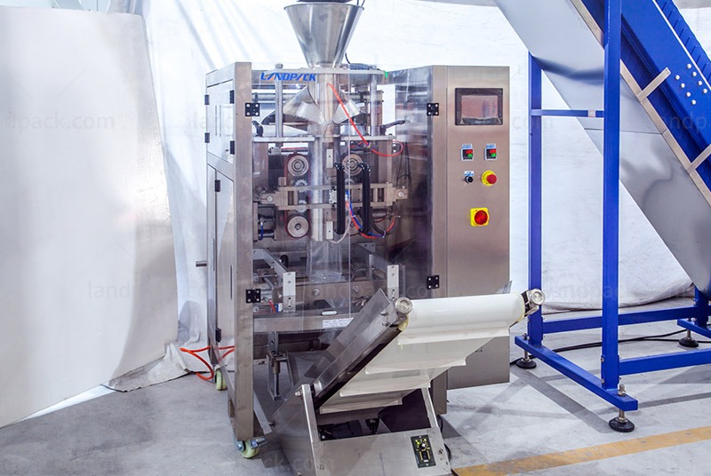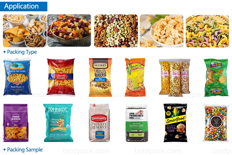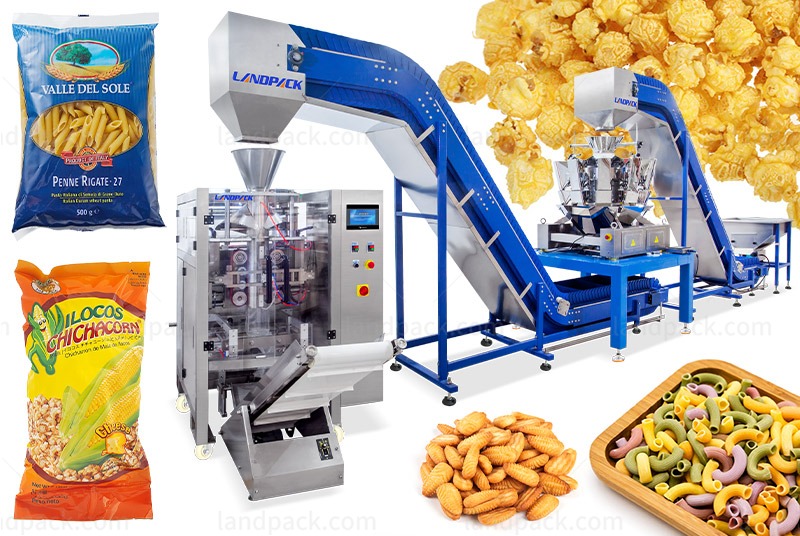 Automatic Snacks Puff Vertical Packing Machine With Secondary lifting feeding + weighing. It suitable for packaging in food, agriculture, pharmaceutical, cosmetics, chemical and other industries. such as puff, snacks, beef jerky, biltong, chicken nuggets, pet foods, frozen foods, vegetables, fruits, candies, chemicals and other particles.