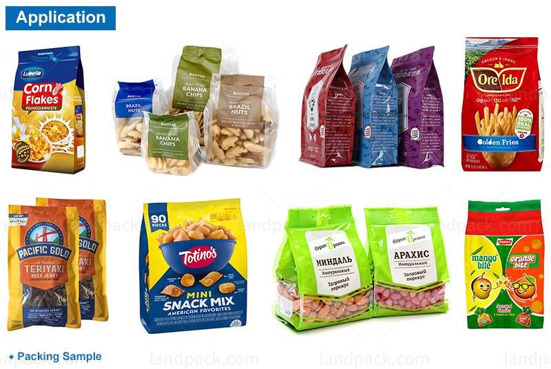 Quad seal bag/ block bottom pouch packing machine, Suitable for various kinds of snacks, nuts, coffee beans, peanuts leavened food, candies, seeds and such materials in grain or piece as well as powder like milk powder, washing powder, starch, etc.