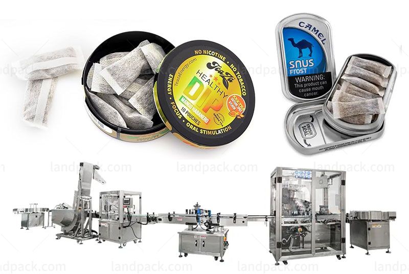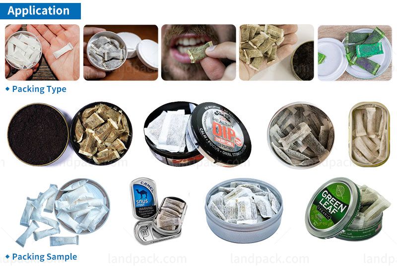 This full automatic snus sachet in can packing machine line is suitable for many kinds of powder products, such as snus powder, herb powder, tobacco powder, snuff powder, smokeless tobacco, etc.