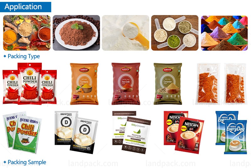 The powder packaging machine has accurate metering, beautiful packaging, and is equipped with a thermal transfer printer. It is suitable for packaging various powder products, such as milk powder, sugar powder, coffee powder, wheat flour, detergent powder, coconut powder, spice powder, etc.