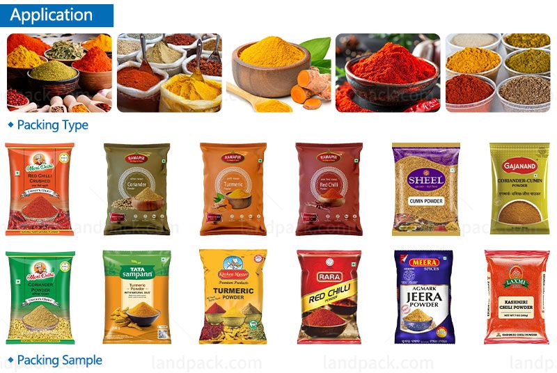 Suitable for automatic packaging of various kinds of powder, such as spice powder, milk, coffee, chili powder, sugar, soap powder, curry powder, washing powder, etc.