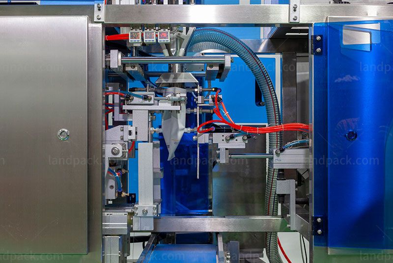 Machine machines can equip with a different metering system like a weigher, liquid pumps, auger filler, bucket chain for different kinds of product filling and packing in premade bags.