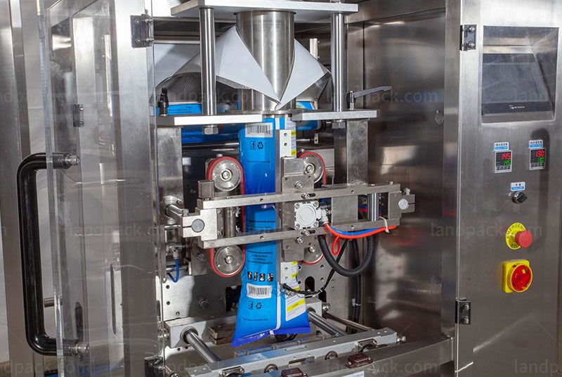 1. The machine can automatically complete the product measuring, conveying and feeding, filling and bag forming, date code printing, bag sealing, and cutting.