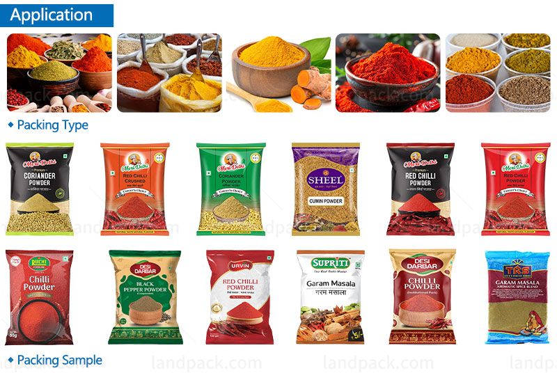 Suitable for automatic packaging of various kinds of powder, such as spice powder, milk, coffee, chili powder, sugar, soap powder, curry powder, washing powder, etc.