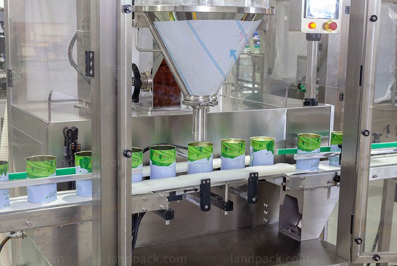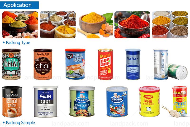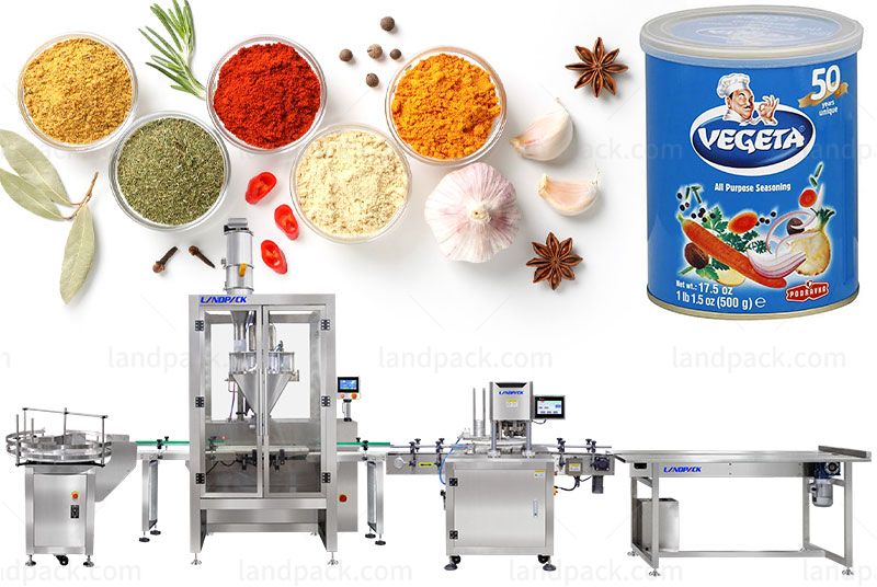 The spice can filling sealing machine line is mainly used to powder filling of various material metering into can. Likes spice powder, condiment powder, seasoning powder protein powder, condiment and other powder materials. Automatically complete a series of tasks such as bottle management, cleaning, measuring, filling, sealing.