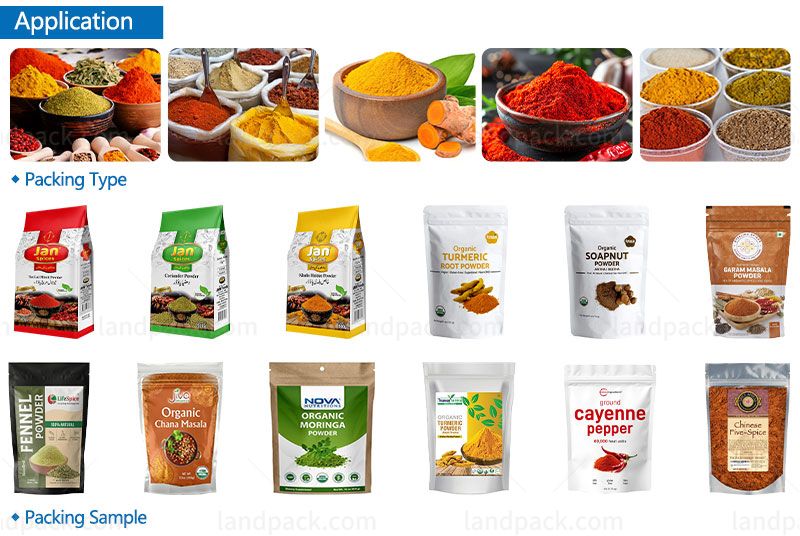 Suitable for the automatic packing of powder: spice powder, seasoning powder, flour, wheat flour, coffee powder, milk powder, food additives, condiments, coconut powder, pesticide powder, etc.