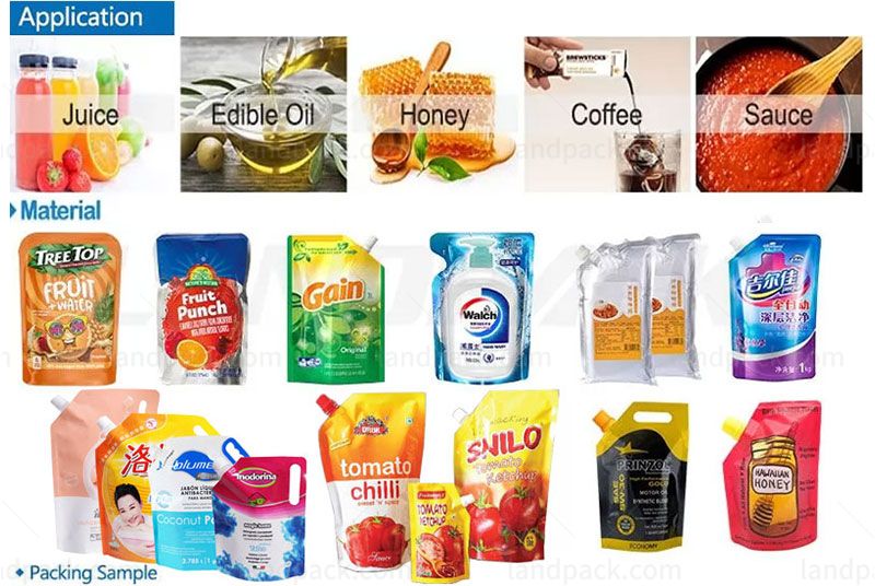 Applicable Pouches: spout pouch, squeeze pouch, 3-side, 4 side sealing bag, stand-up bag, handbag, zipper bag, compound bag, etc.