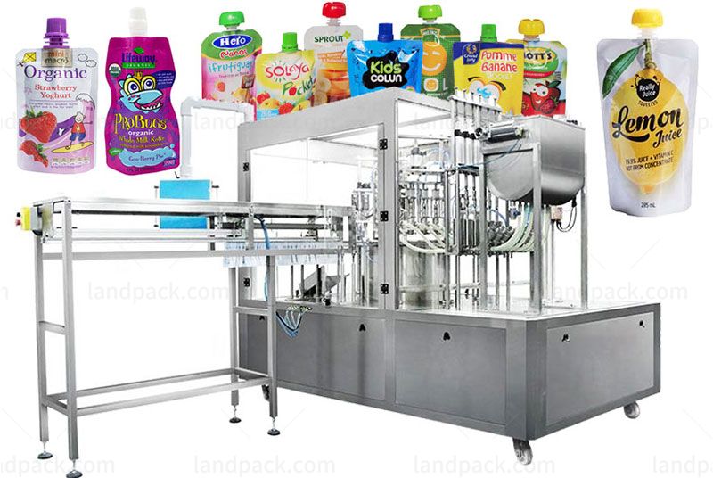 Rotary automatic spout pouch squeeze pouch filling capping machine(LD810L), It is widely used for a variety of liquid products, such as puree, jelly, fruit juices, milk, butter, paste, chemical liquid, water and so on.