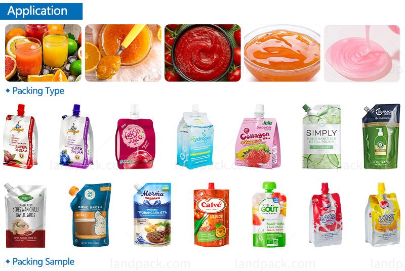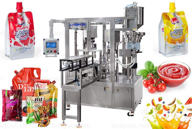 A versatile spout pouch squeeze pouch filling capping machine is ideal for jelly, milk, butter, fruit juices, paste, chemical liquids, water, and more. It is perfect for efficient packaging across various industries.