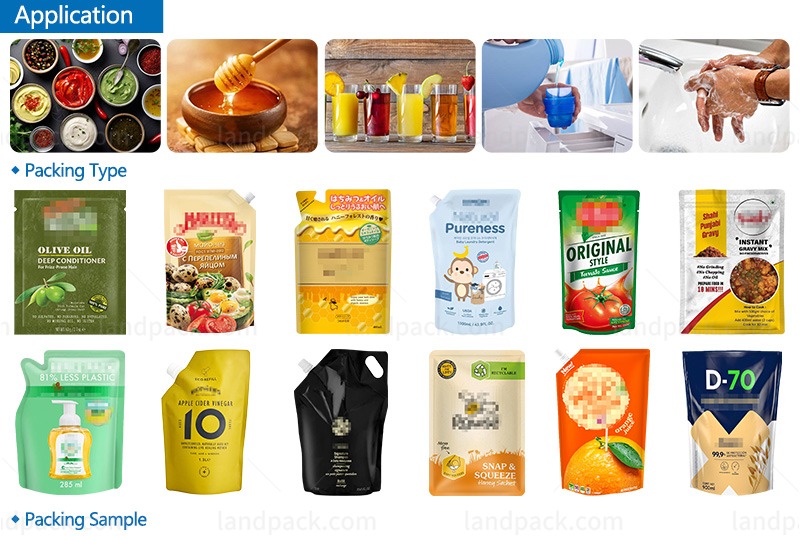 Compatible with a wide range of premade flexible pouches, including corner-spouted pouches, stand-up pouches, doypack bags, flat-bottom pouches, and other premade laminated bags designed for liquid or semi-liquid products.