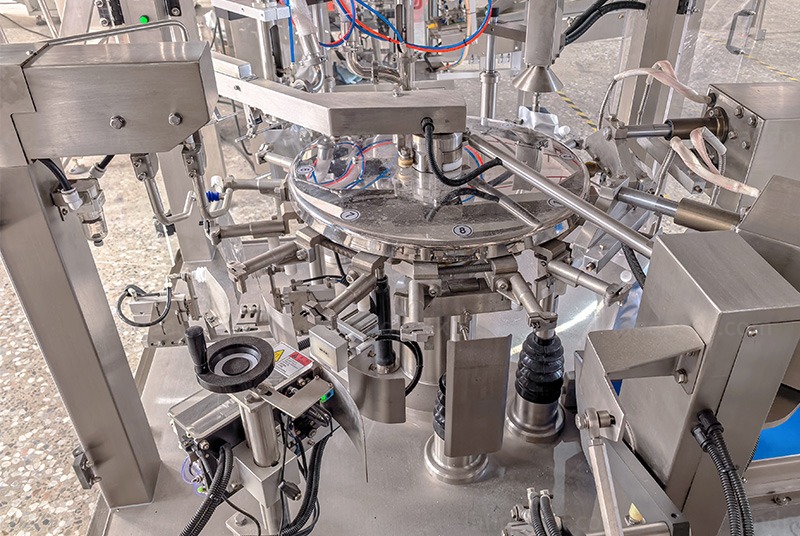 1. Bag Feeding – The gripper automatically picks up premade pouches and places them onto the rotary station.